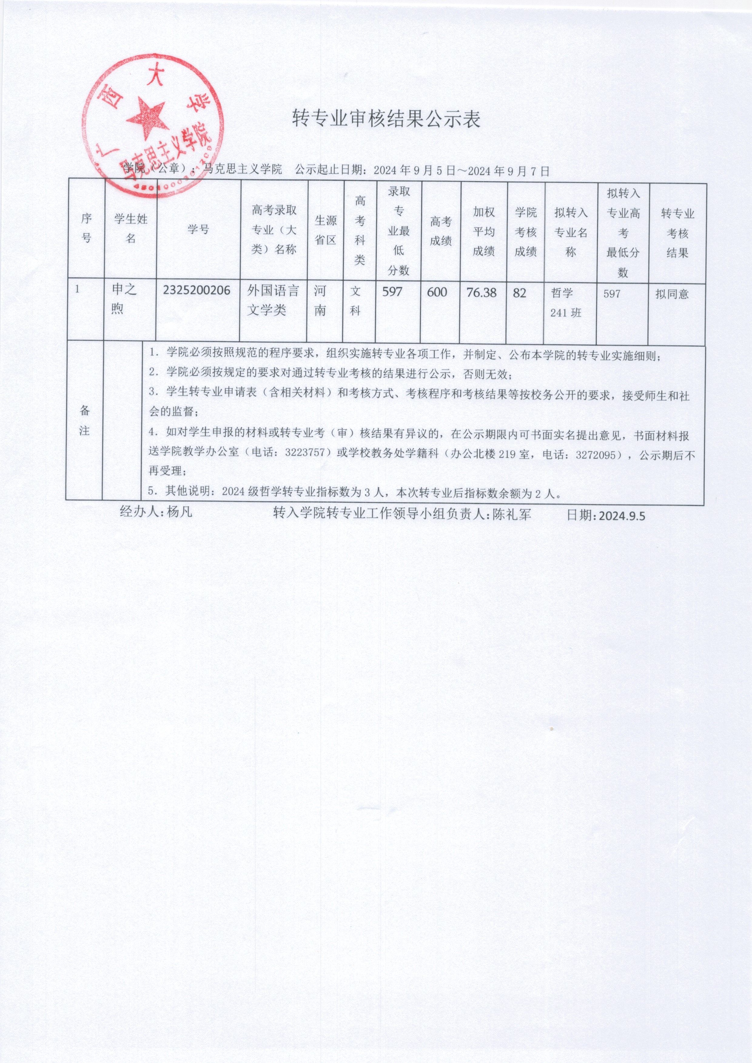 转专业审核结果公示表