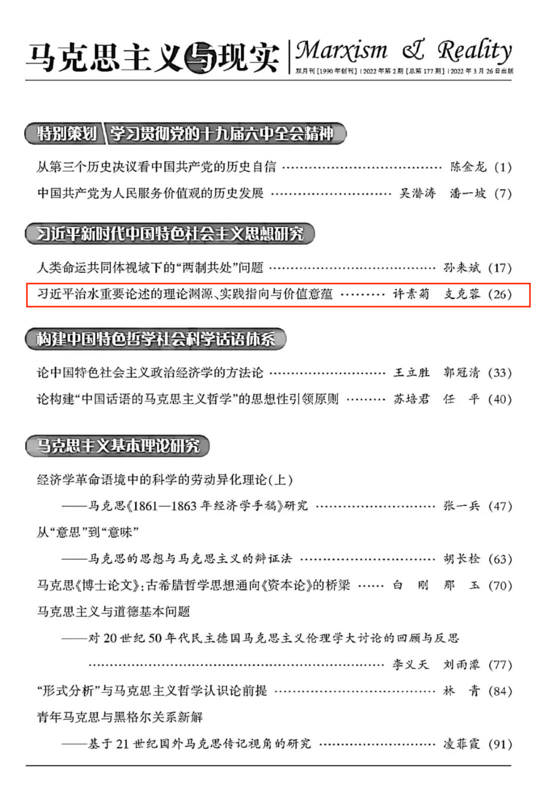 2138CC太阳集团教师许素菊教授、博士研究生支克蓉在《马克思主义与现实》(2022年第2期)上发表学术论文《习近平治水重要论述的理论渊源、实践指向与价值意蕴》。《马克思主义与现实》是由中央党史和文献研究院主管主办、中央编译出版社出版发行,是重点研究马克思主义理论的专业性学术刊物。此刊作为2017年度中国百强报刊、国家社科基金首批资助期刊、全国中文核心期刊、中国人文社会科学核心期刊、中文社会科学引文索引来源期刊(CSSCI),在学术界和理论界占有重要地位,并为广大读者所关注。