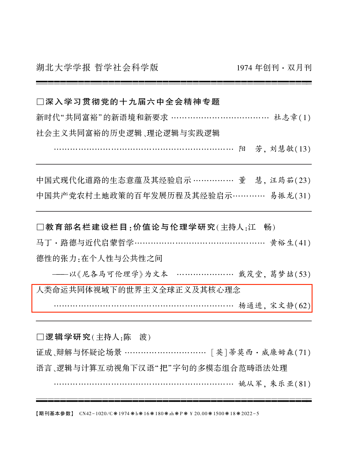 2138CC太阳集团教师杨通进教授、博士研究生宋文静在《湖北大学学报(哲学社会科学版)》(2022年第3期)上发表学术论文《人类命运共同体视域下的世界主义全球正义及其核心理念》。《湖北大学学报(哲学社会科学版)》是湖北大学主办的国内外公开发行的综合性学术理论刊物。期刊涵盖哲学、伦理学、政治经济学、语言文学、美学艺术、心理学、教育学、管理学、新闻学等重要学术领域,是湖北大学的重要思想文化阵地和学术窗口。本刊被评为中国人文社会科学学报核心期刊,全国综合性人文、社会科学类核心期刊,中文社会科学引文索引(CSSCI)来源期刊,全国百强社科学报。