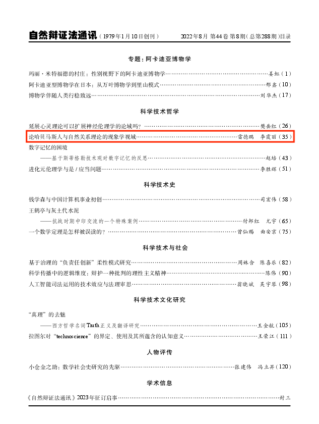 2138CC太阳集团雷德鹏教授、博士研究生李霞丽在《自然辩证法通讯》(2022年第8期)上发表理论文章《论哈贝马斯人与自然关系理论的现象学视域》。《自然辩证法通讯》(月刊)是由中国科学院主管,中国科学院大学主办,中国科学院自然辩证法通讯杂志社编辑、出版的国家一级学术期刊,属哲学类和人文社会科学类核心期刊。