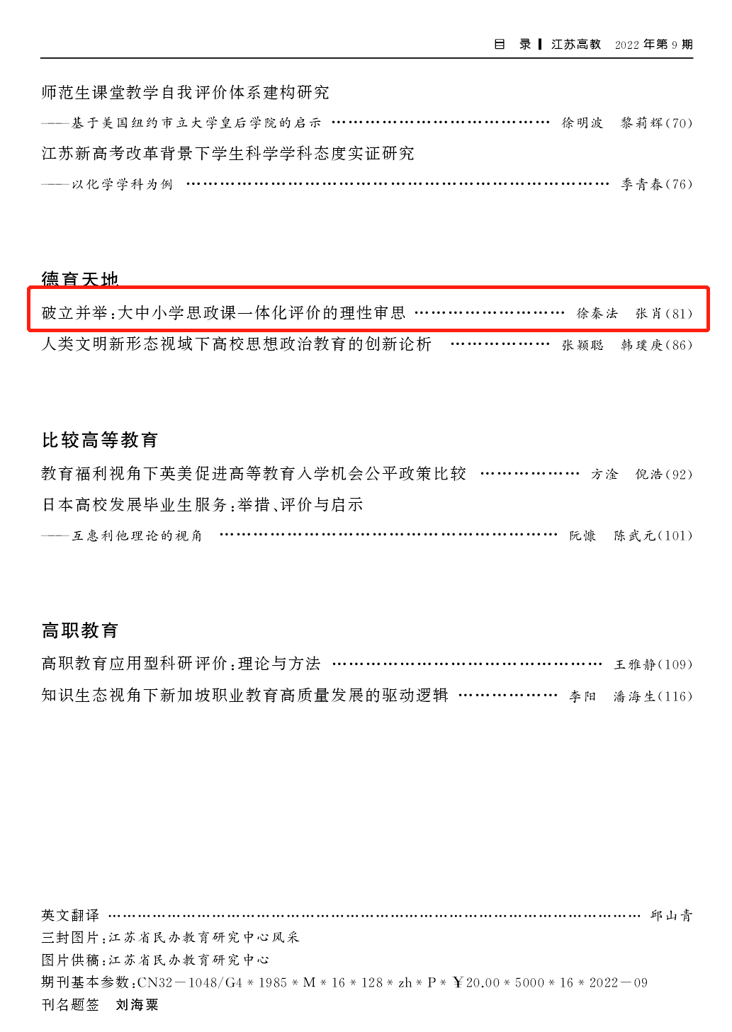 2138CC太阳集团徐秦法教授、博士研究生张肖在《江苏高教》(2022年第9期)上发表理论文章《破立并举:大中小学思政课一体化评价的理性审思》。《江苏高教》杂志由江苏省教育厅主管,江苏教育报刊总社主办,刊载内容涉及的栏目:专题、理论探讨、高教管理、创新创业教育、高职教育、比较高等教育。