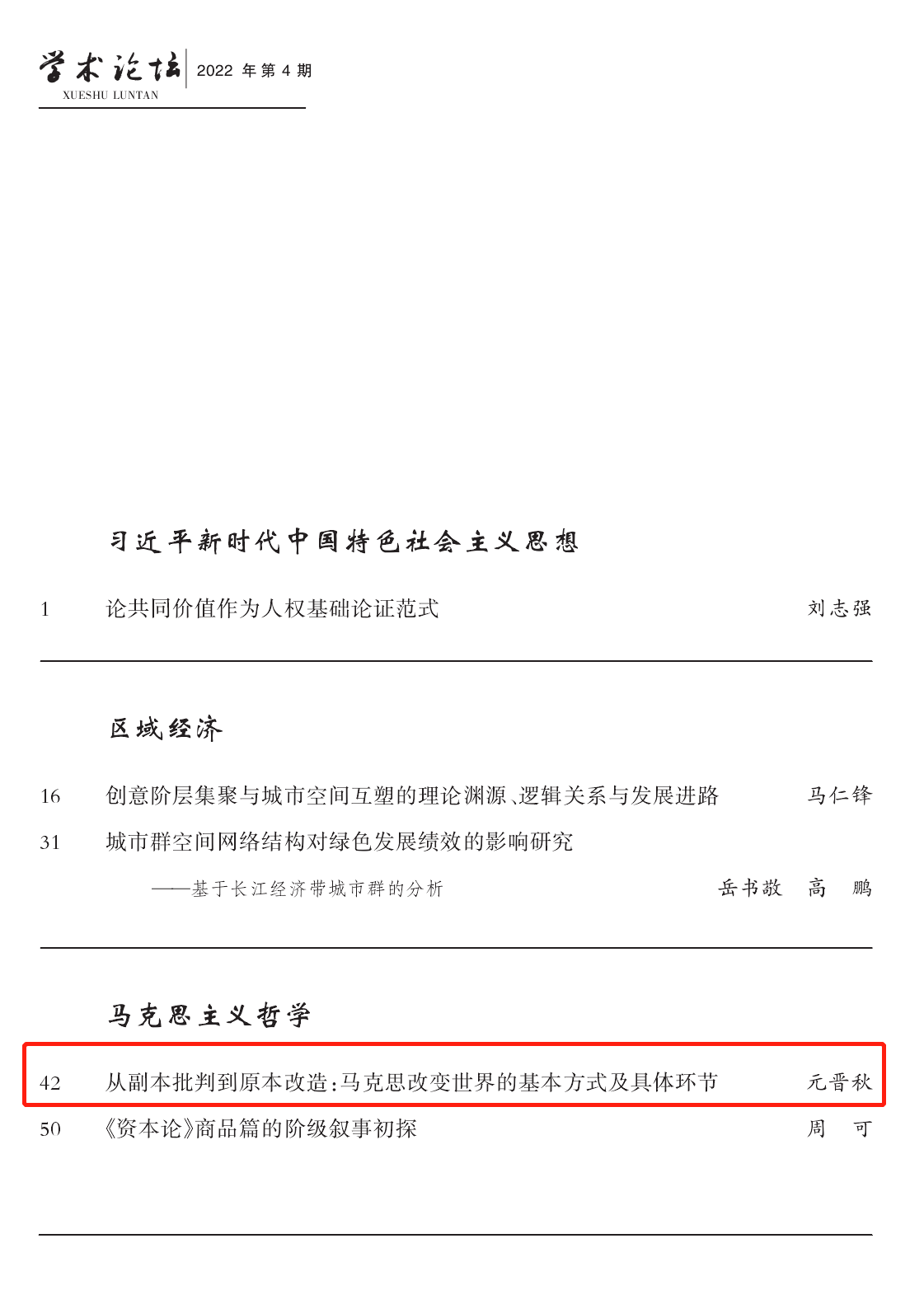 2138CC太阳集团元晋秋副教授在《学术论坛》(2022年第4期)上发表理论文章《从副本批判到原本改造:马克思改变世界的基本方式及具体环节》。《学术论坛》是由广西社会科学院主管主办的综合性哲学社会科学学术期刊。期刊坚持以马克思列宁主义、毛泽东思想、邓小平理论、“三个代表”重要思想、科学发展观、习近平新时代中国特色社会主义思想为指导,秉承学术性、思想性、战略性的办刊方针,以研究哲学社会科学重大理论问题和现实问题为基本定位,追踪学术前沿,倡导理论创新,致力于打造一个高水平、有特色的学术交流平台。