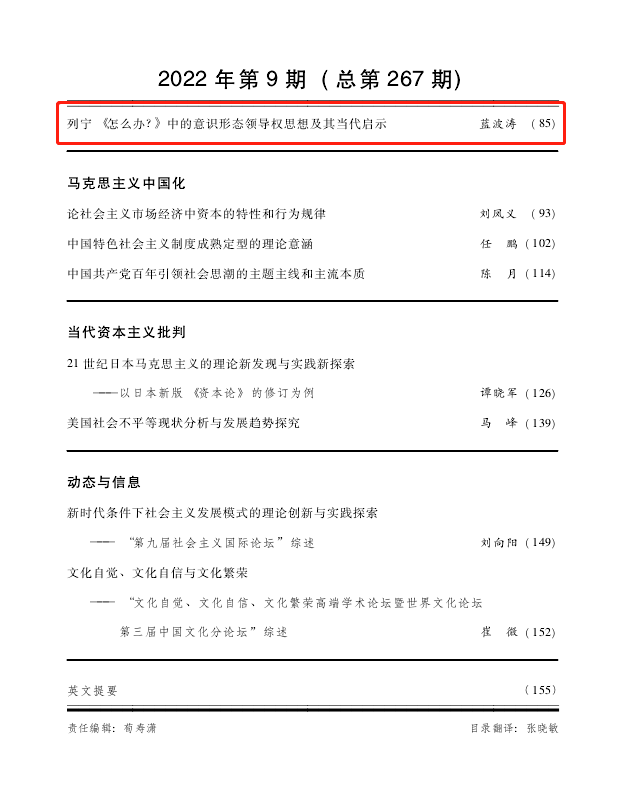 我院蓝波涛副教授在《马克思主义研究》(2022年第9期)上发表理论文章《列宁<怎么办?>中的意识形态领导权思想及其当代启示》。《马克思主义研究》是由中国社会科学院主管、中国社会科学院马克思主义研究院主办,以专门研究和宣传马克思主义整体理论为宗旨的大型学术理论刊物。该刊物一贯坚持以马克思主义为指导,始终坚持政治性与学术性相统一,强调思想性、批判性和创新性,刊载运用马克思主义立场、观点、方法分析重大理论和现实问题的文章,同时积极刊发研究、宣传、阐释习近平新时代中国特色社会主义思想的文章,提供丰富的国内外马克思主义研究动态和信息。