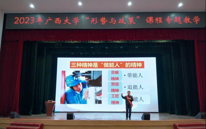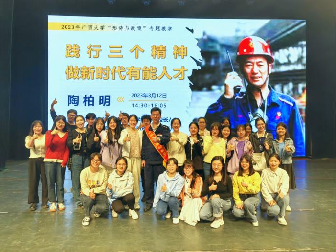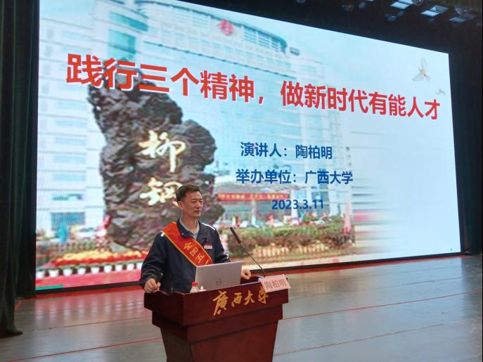 2023年3月11日,在我校大礼堂举行的“形势与政策”课程专题教学报告会上,柳州工匠学院-柳钢集团工匠学校执行校长、全国五一劳动奖章获得者、百名全国劳动模范服务团,百名广西产业工人“二十大精神”宣导团,柳州市劳模工匠宣讲团成员陶柏明先生为到场师生做了题为“践行三个精神,做新时代有能人才”的报告。