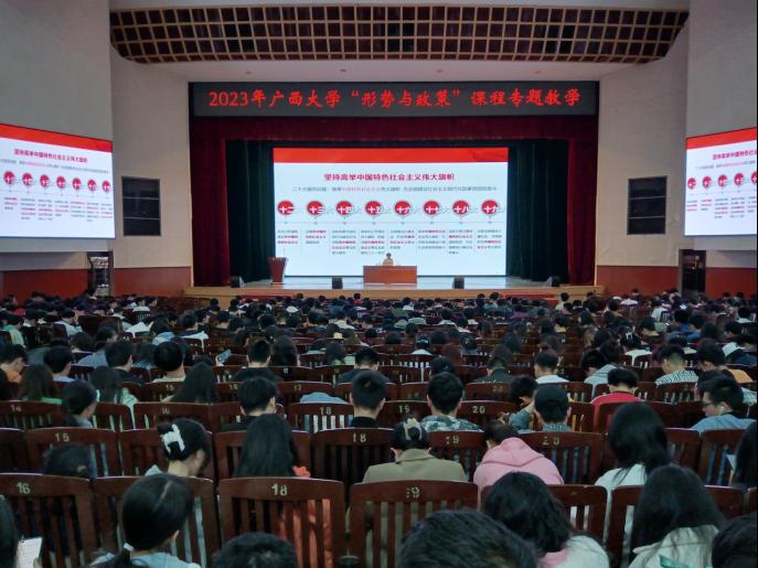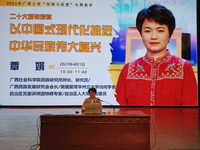 2023年4月1日上午,我校大礼堂举行了“形势与政策”课程专题教学报告会。广西社会科学院民族研究所所长、研究员,广西民族发展研究会会长,自治区人大常委会委员覃娟同志为到场师生做了题为“以中国式现代化推进中华民族伟大复兴——深入学习领会党的二十大精神”的报告。