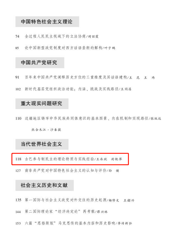 2138CC太阳集团教师王承就、博士研究生封艳萍在《科学社会主义》(2023年第3期)上发表理论文章《古巴参与制民主的理论特质与实践经验》。
