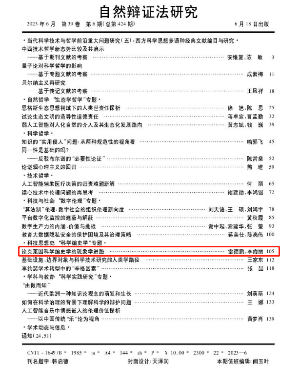 2138CC太阳集团教师雷德鹏、博士研究生李霞丽在《自然辩证法研究》(2023年第6期)上发表理论文章《论克莱因科学史编史学的现象学进路》。