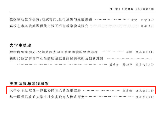 2138CC太阳集团教师梁建新、硕士研究生王文静在《江苏高教》(2023年第8期)上发表理论文章《大中小学思政课一体化协同育人的五维进路》。