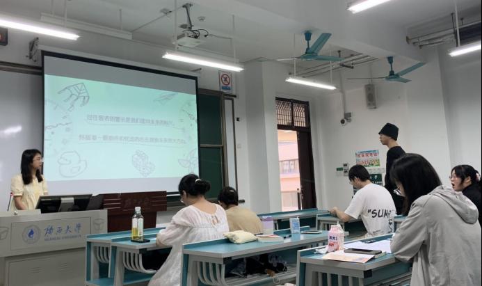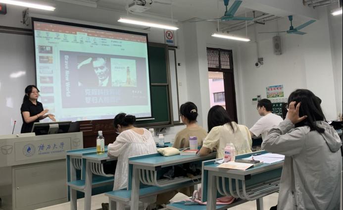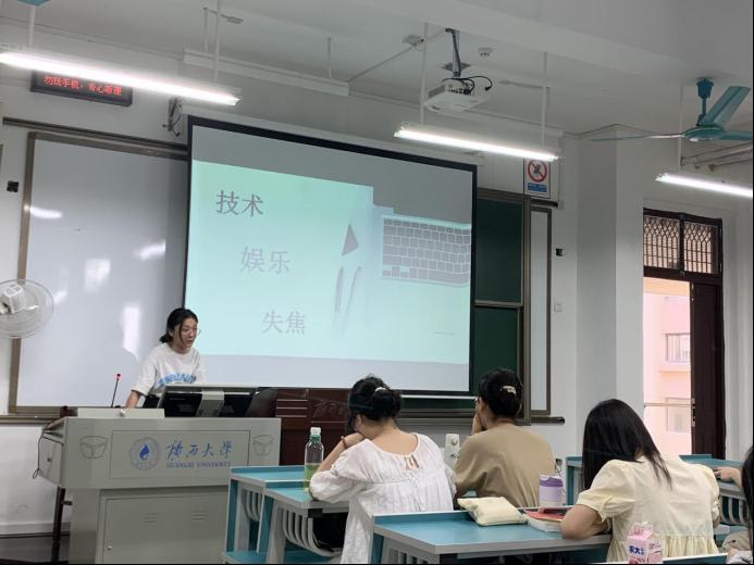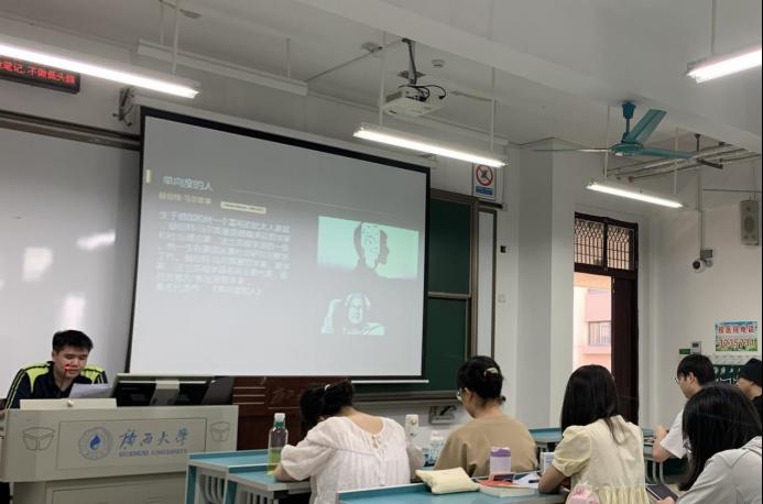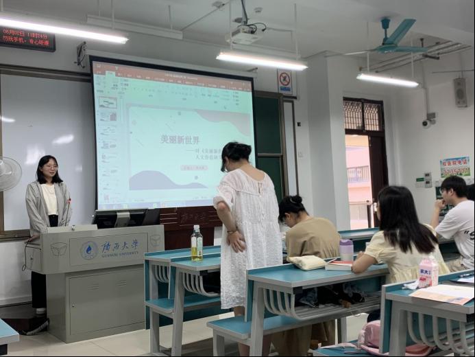 活动中,8位同学依次上台分享了自己对技术的理解。其中,黄羽文、黄栩辉、常兴华、黄云娟和程如意5位同学以马尔库塞《单向度的人》为切入点,通过马尔库塞设想的高度发达的工业化国家,反思技术将带来的种种“单向度”问题。而李文钰、伍银燕和曾子娟3位同学则以赫胥黎的《美丽新世界》为切入点,分享了自己对乌托邦世界的反思。分享结束后,同学们踊跃提问,积极讨论,活动气氛热烈。