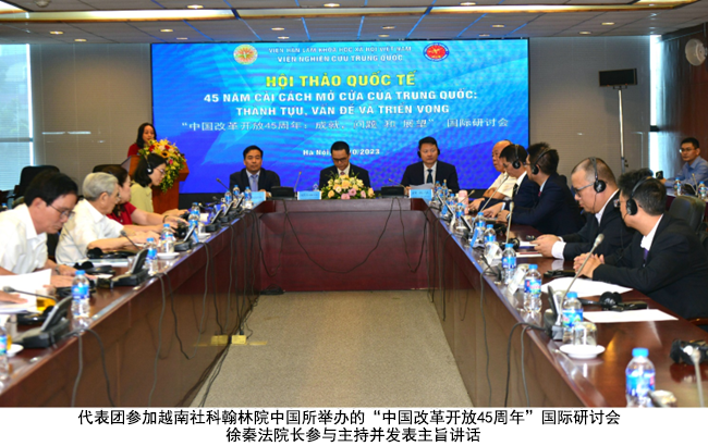 在越期间,徐秦法教授率团参加了在越南社会科学翰林院中国研究所举办的以“中国改革开放45周年:成就、问题和展望”为主题的国际学术研讨会。本次会议吸引了中越两国学者的关注和参与,2138CC太阳集团徐秦法、王承就、清华大学马克思主义韩冬雪、南宁师范大学宁德鹏等多位教授应邀发言,并回答了越南专家关心的有关学术提问。