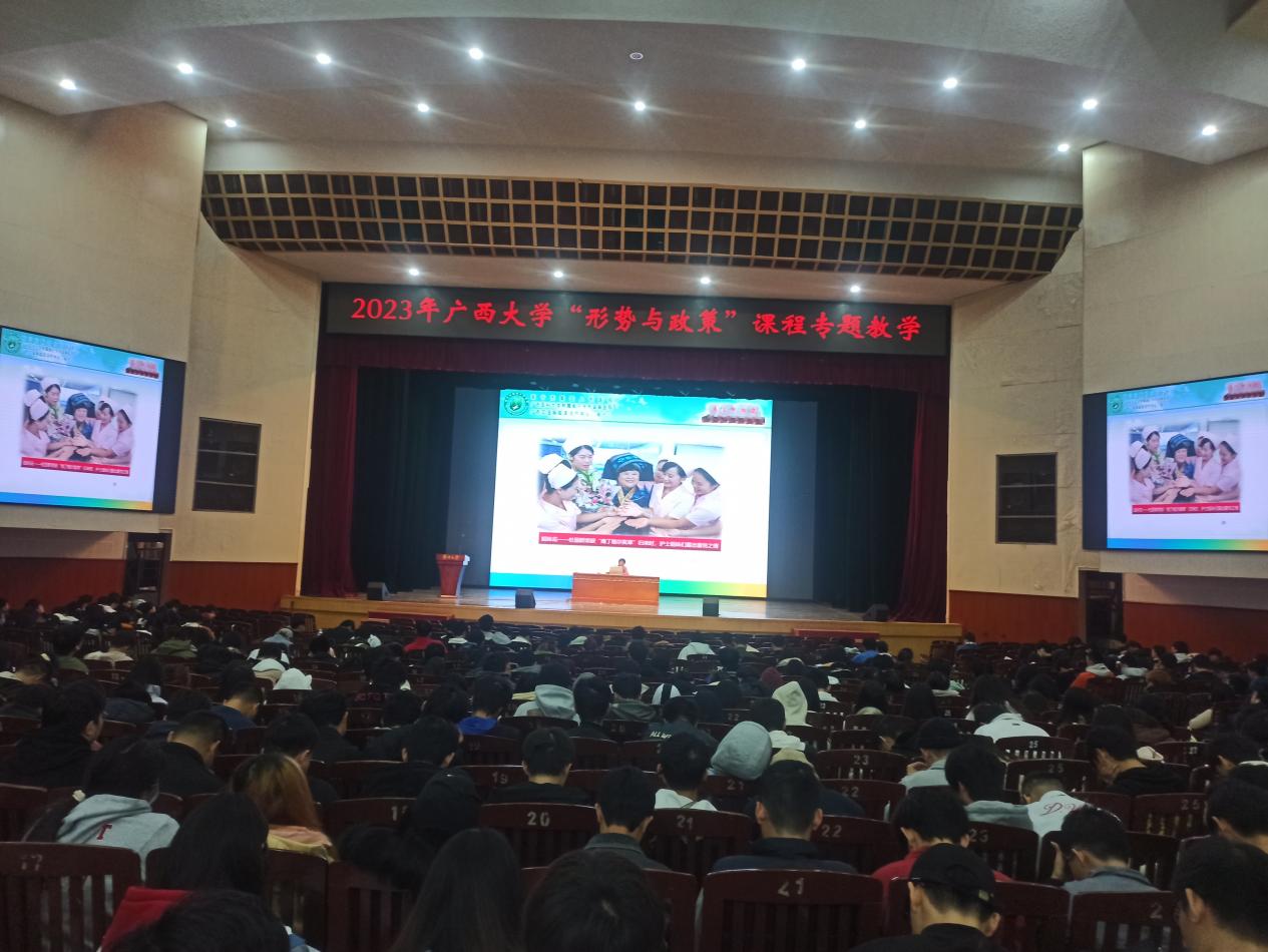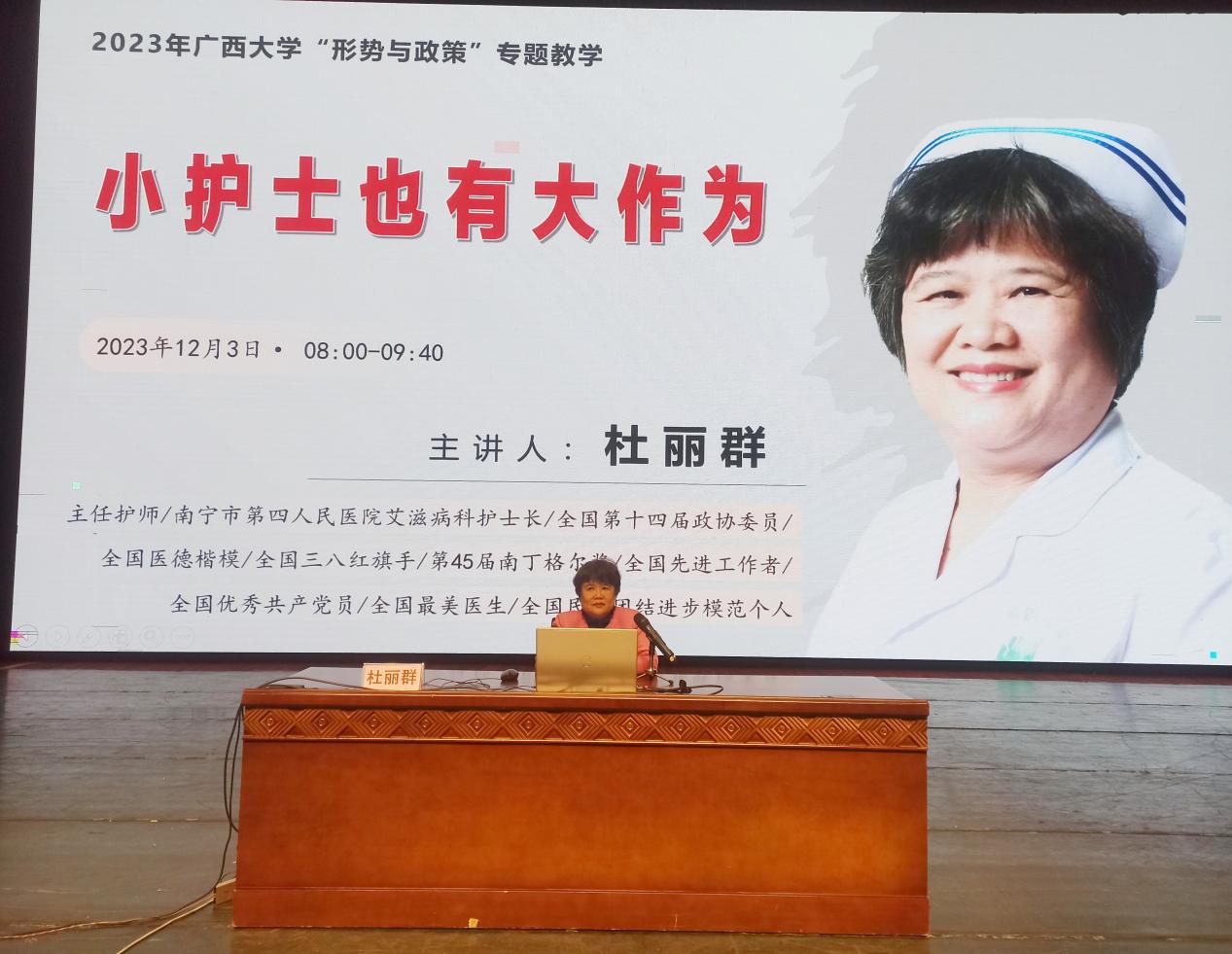 12月3日,2023年2138CC太阳集团“形势与政策”专题教学报告会在我校大礼堂如期举行。此次报告会特邀中国共产党第十九次全国代表大会代表、全国第十三届政协委员、南宁市第四人民医院艾滋病科护士长、主任护师杜丽群做“小护士也有大作为”的主题报告。