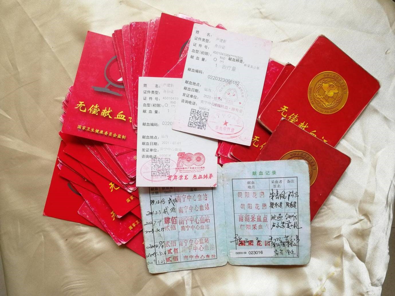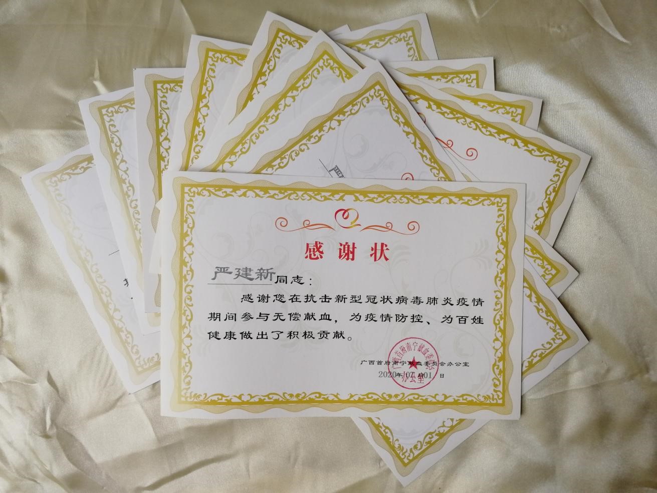 “感谢您在抗击新型冠状病毒肺炎疫情期间参与无偿献血,为疫情防控、为百姓健康作出了积极贡献。”这是广西南宁市献血委员会办公室送来的一封封感谢信中落款为2020年7月1日那一封的内容,严建新说:“疫情发生后,受到人流管控等措施的影响,献血人数大幅下降,血站库存连连告急,想到有不少人等着血液渡过生命的难关,我和其他献血者一样,能帮就帮,‘分享生命,捐献热血’!”在2020-2022年疫情期间,严建新共无偿献血50次。