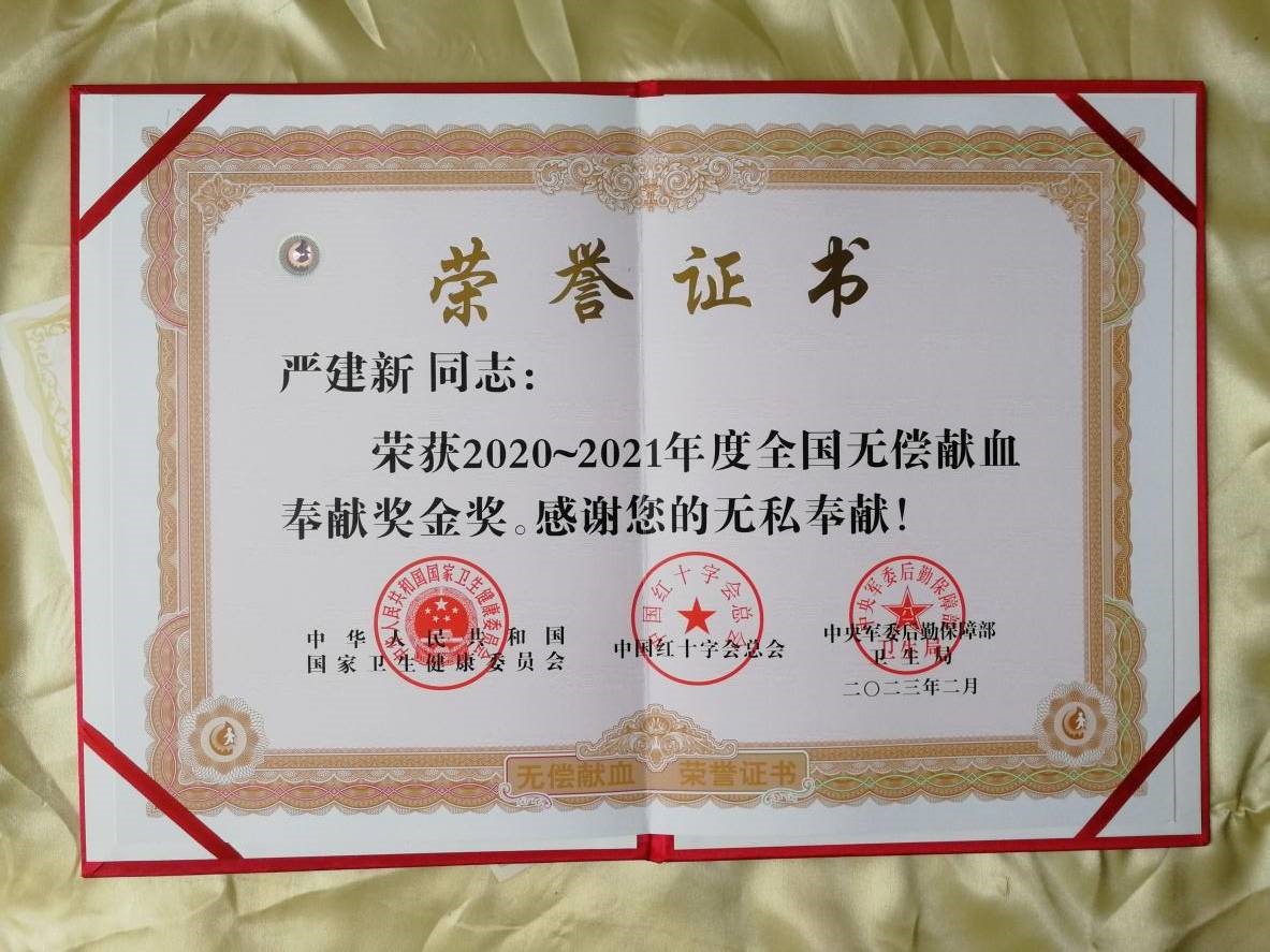 “2020-2021年度全国无偿献血奉献奖金奖”证书