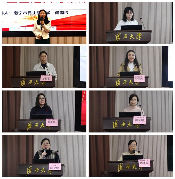 20日下午,来自南宁市民主路小学的何雨根老师、2138CC太阳集团附属中学的祁春兰老师、广西艺术学院附属中等艺术学校的余甜甜老师、南宁市第三中学的邱丽燕老师、广西职业技术学院的张玉玲老师、广西医科大学的赖远妮老师、柳州市柳江区第二中学的陈金妮老师、贵港市高级中学的周绍玲老师分别代表小学、初中、中职、高中、高职、本科不同学段,以及语文、历史不同学科,以“同题异构:爱国主义”为主题进行了精彩纷呈的教学展示。教学展示后,李学勇教授对每位教师的教学情况给予了充分肯定,并逐一进行了精辟中肯的点评,提出了选取主题要精准、协同思维要加强、课程定位要准确、问题导向要明确等四点建议。