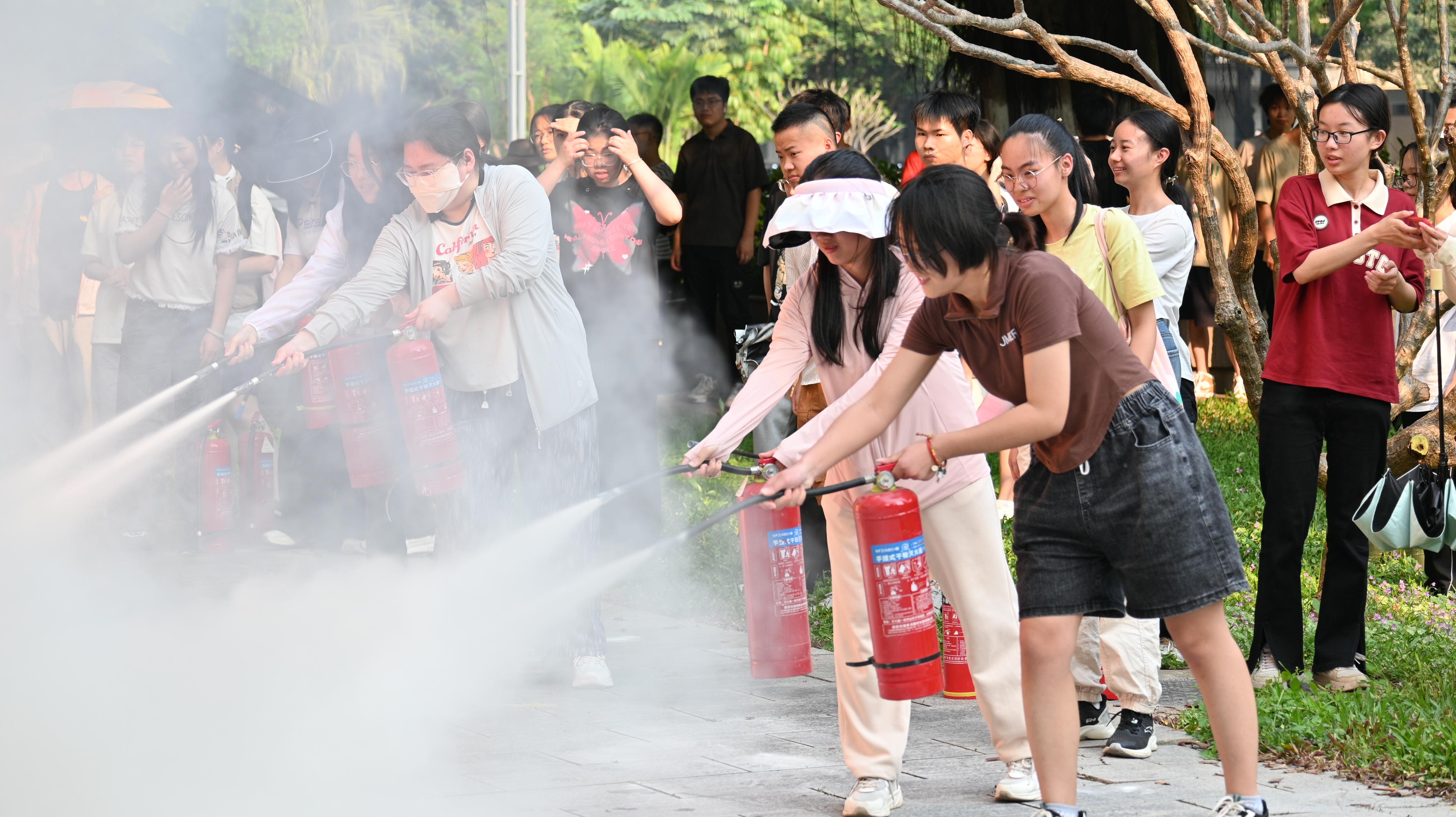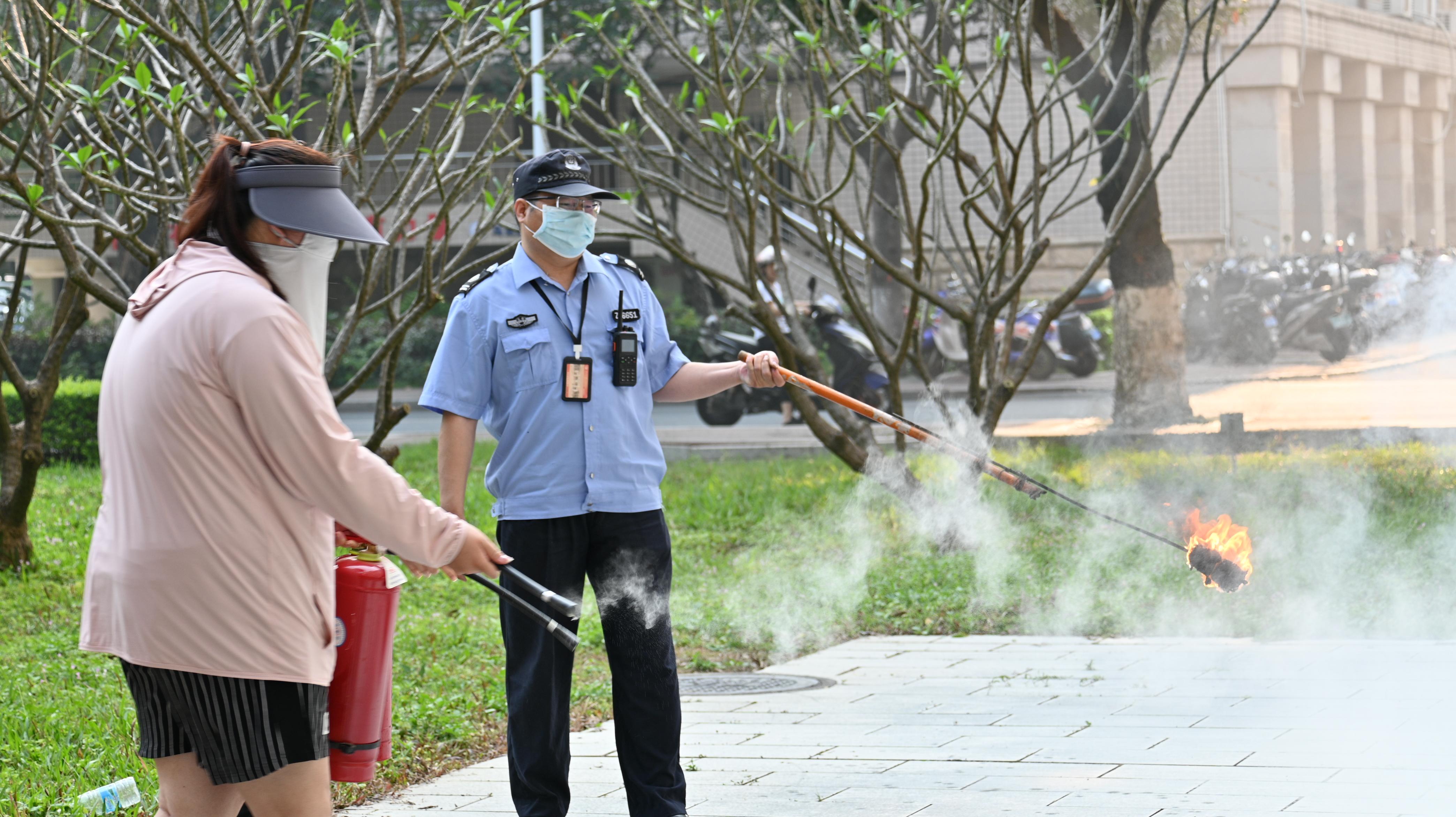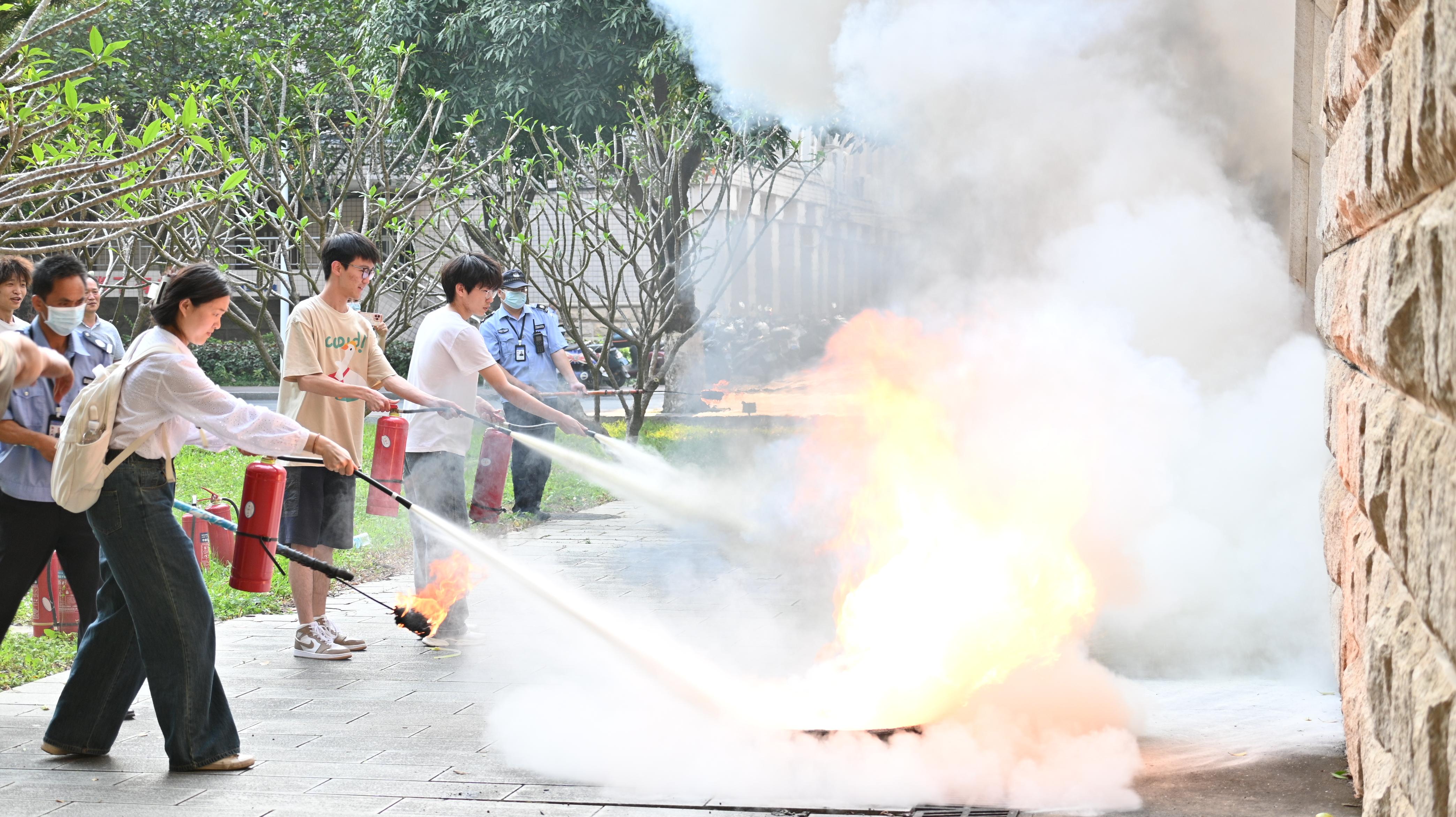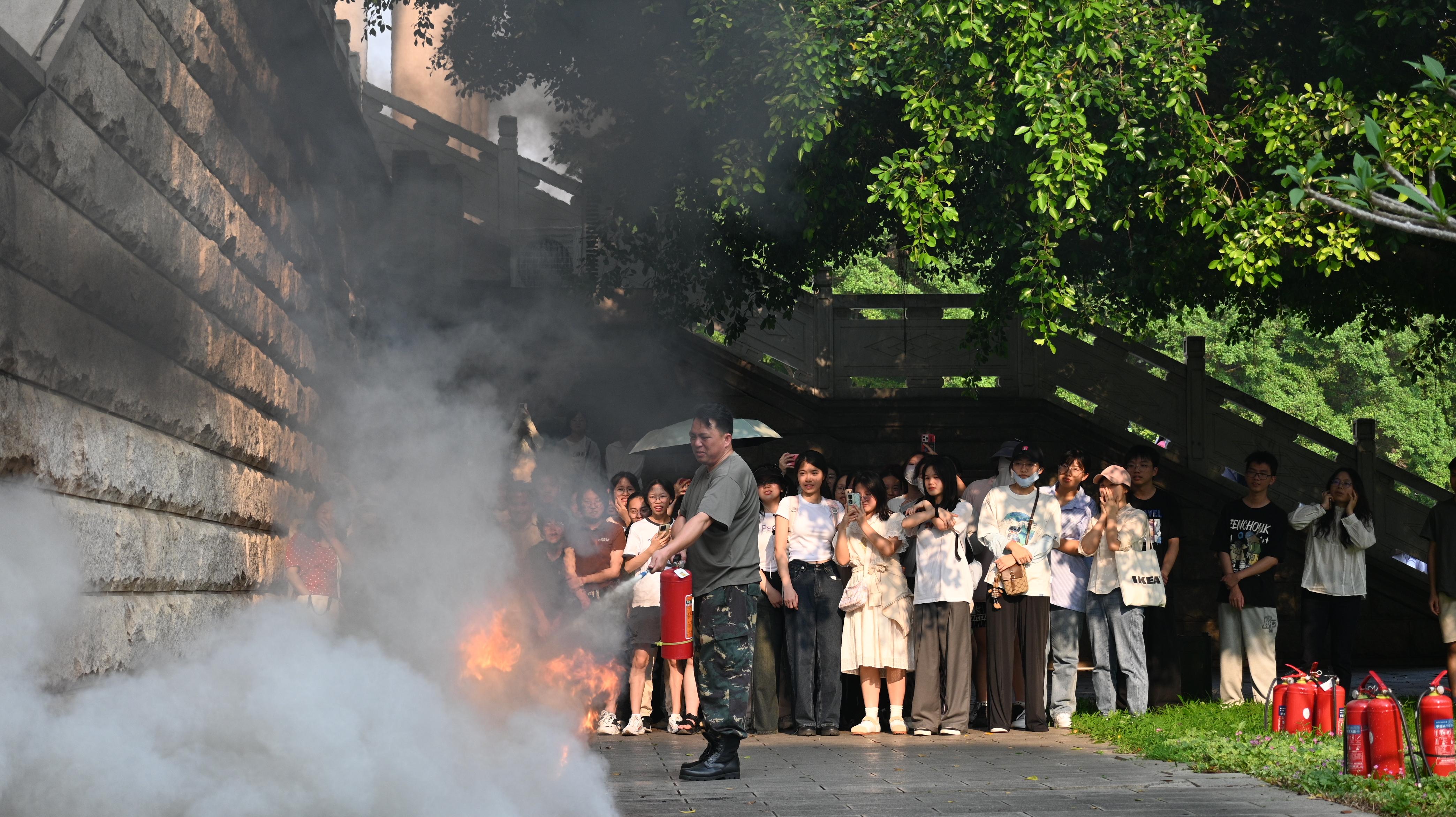 在消防安全讲堂上,保卫处黄光电老师以生动的例子向在场师生详细讲解了灭火器的正确用法。随后,在保卫处老师的组织下,师生们开展了火灾模拟逃生演练。随着警报器响起,大家用湿毛巾捂住口鼻,低着腰,沿着墙壁有序逃离到西综合楼前空旷广场。最后,师生们还切身体会了灭火的过程,实地演练灭火器的使用方法。