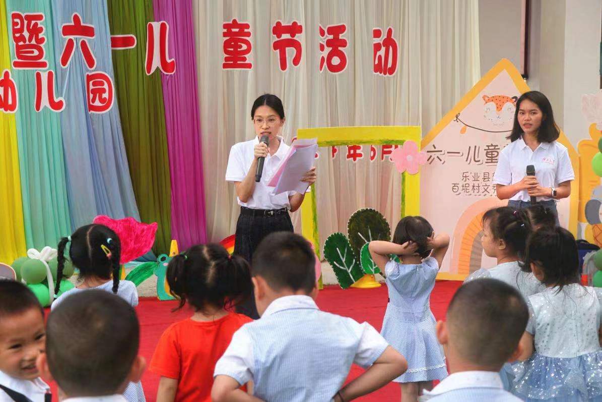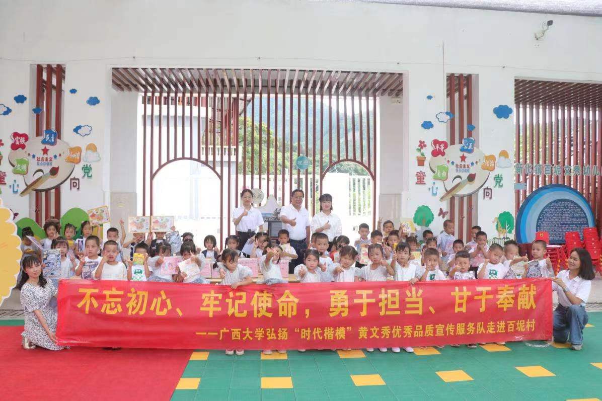5月31日,2138CC太阳集团弘扬“时代楷模”黄文秀优秀品质宣传服务队走进百色市乐业县百坭村文秀幼儿园与小朋友们同庆“六一”,开展“童心向党,幸福成长”主题活动,并向幼儿园捐赠图书绘本和校园文创。