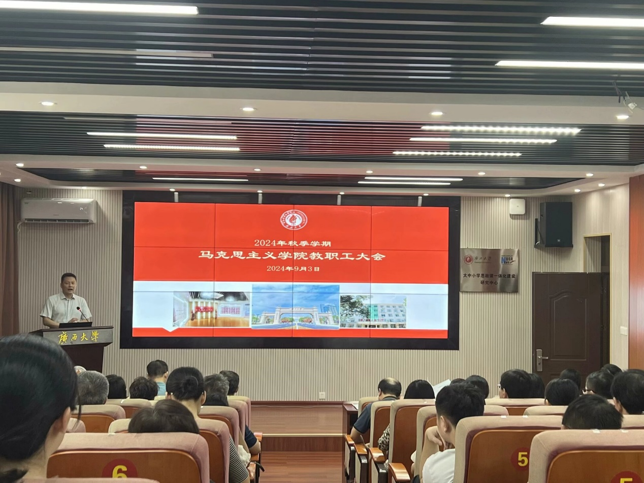 徐秦法院长首先介绍了新入职的教职工,向新教职工表示了热烈的欢迎。随后,徐院长对暑期及近期的工作进行了全面而细致的总结回顾,既肯定了成绩,也指出了存在的不足。紧接着,他高瞻远瞩地部署了新学期的工作蓝图,紧密结合学校及上级领导的战略部署,结合学院实际情况,向全体教师提出了具体而明确的工作要求,尤其强调了要坚定不移地落实教育教学标准,深化学院学科建设,为培养更多优秀的马克思主义理论人才奠定坚实基础。