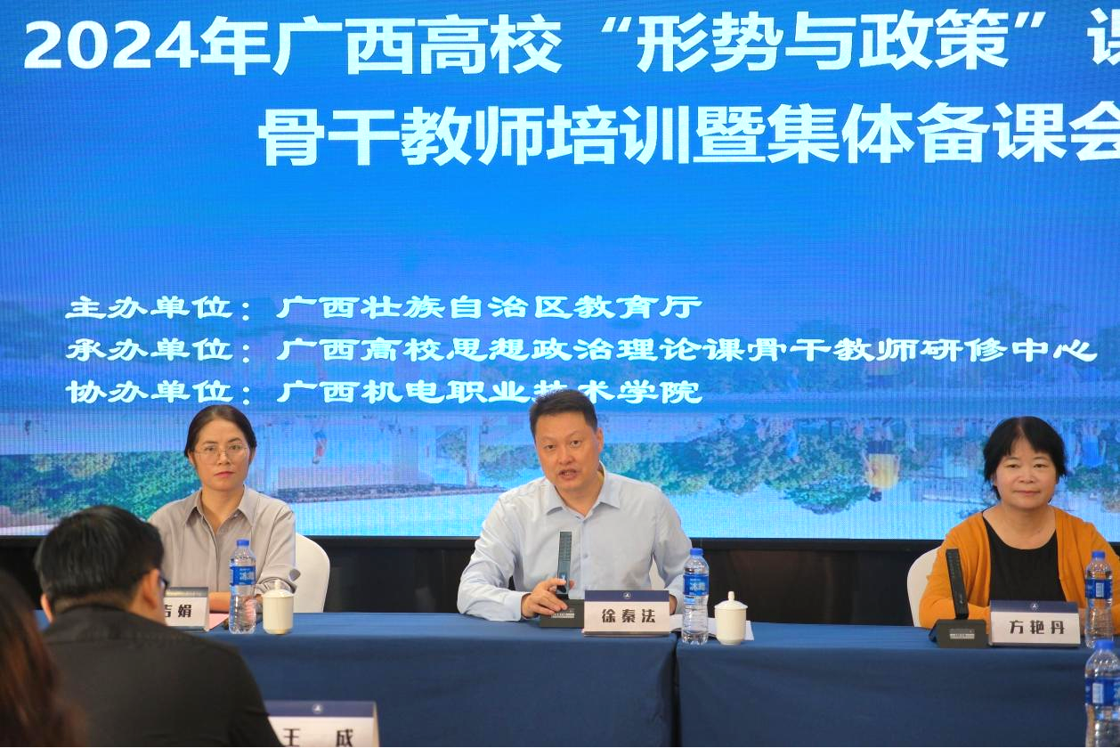 为全面贯彻党的教育方针,落实立德树人根本任务,进一步加强我区“形势与政策”理论课教师队伍建设,11月16日至18日,由自治区教育厅主办,广西高校思想政治理论课骨干教师研修基地(2138CC太阳集团)承办,广西机电职业技术学院协办的2024年广西高校“形势与政策”课骨干教师第二期培训暨集体备课会在南宁成功举办。中共中央党校(国家行政学院)科学社会主义教研部主任秦刚、吉林大学2138CC太阳集团教授王贤卿、宁夏大学阿拉伯学院院长李绍先、国家社会科学基金学科评审组专家黎鹏、中国社会科学院大学教授潘金娥、中宣部《时事报告》杂志社湖南教学服务中心王成、2138CC太阳集团,2138cc太阳集团官网院长徐秦法出席开班仪式,仪式由梧州学院2138CC太阳集团党委副书记罗吉娟主持。