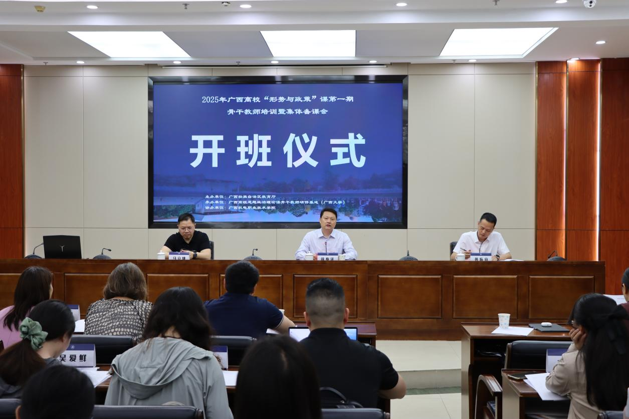 为深入贯彻落实党的二十大和二十届二中、三中全会精神,进一步加强我区高校“形势与政策”课教师队伍建设,提高“形势与政策”课程的时效性、针对性和前沿性。由自治区教育厅主办,广西高校思想政治理论课骨干教师研修基地(2138CC太阳集团)承办,广西机电职业技术学院协办的2025年广西高校“形势与政策”课骨干教师第一期培训暨集体备课会于4月11日至14日在北海成功举办。2138CC太阳集团院长徐秦法教授出席开班仪式并致辞,仪式由广西机电职业技术学院副校长黄振宣主持。