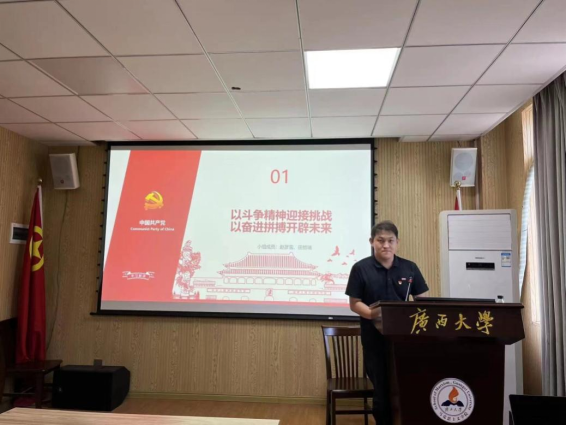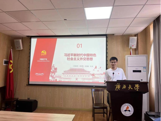 会上,研究生第三党支部宣传委员田哲瑞同志、思政本科党支部党员余汶罡同志分别根据自身学习体会进行了题为《以斗争精神迎接挑战,以奋进拼搏开辟未来》和《习近平外交思想》的宣讲。